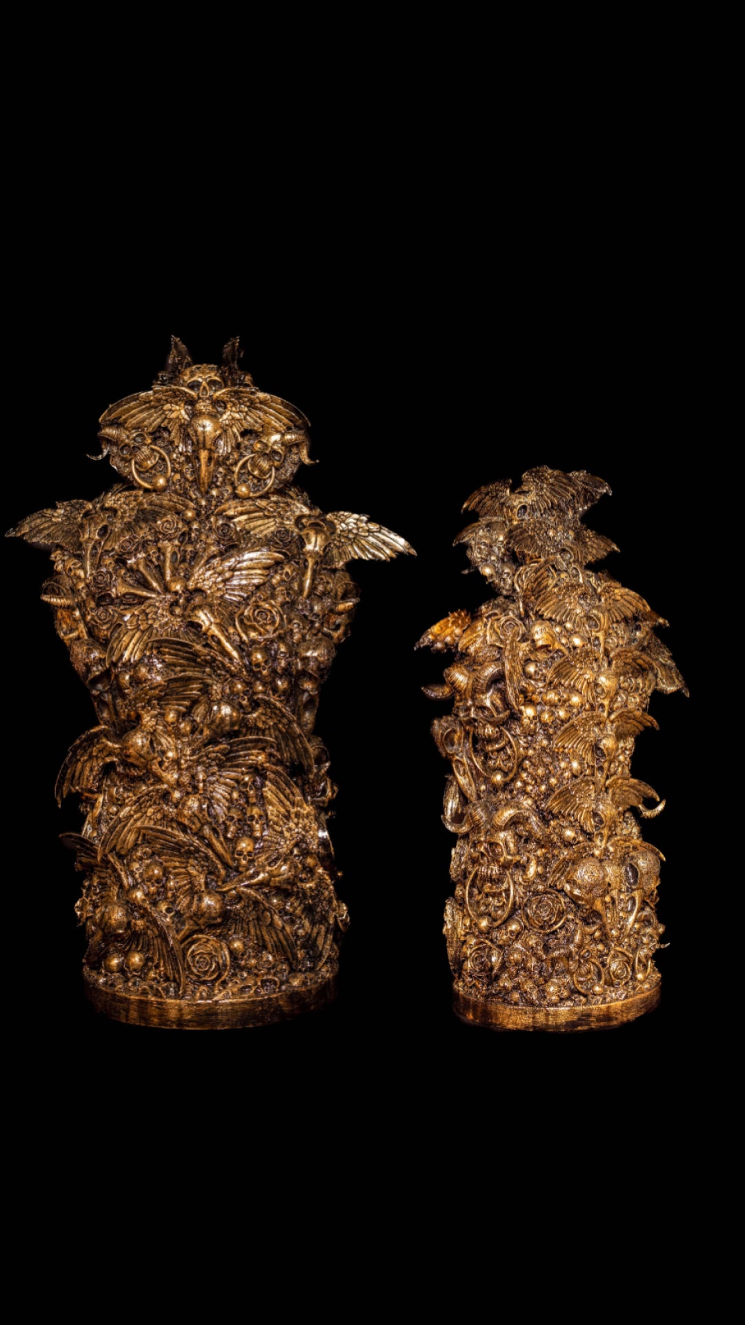 Toutes mes œuvres sont réalisées en résine ou plâtre sur supports en bois.